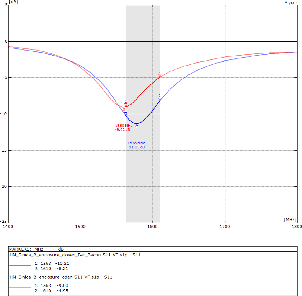 Furthermore, we add two markers at the peak of the red and blue Return Loss curve. The red peak is at with -9.02 dB at 1560 MHz and the blue peak is with – 11.33 dB at 1578 MHz. With the meat close to the GPS antenna we got a frequency jump of 18 MHz (1578 MHz – 1560 MHz).